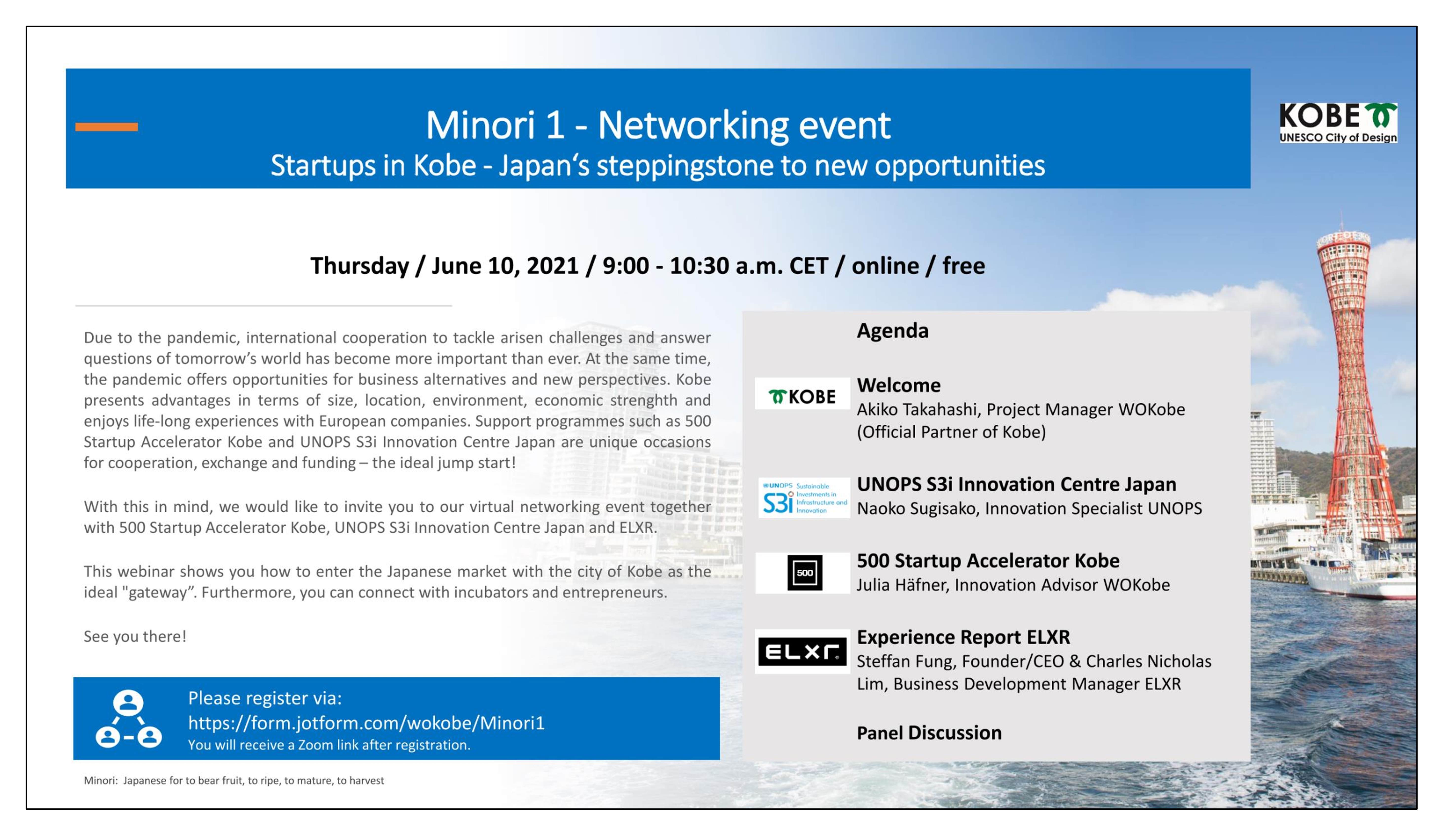 With this in mind, we would like to invite you to our virtual networking event together with 500 Startup Accelerator Kobe, UNOPS S3i Innovation Centre Japan and ELXR.